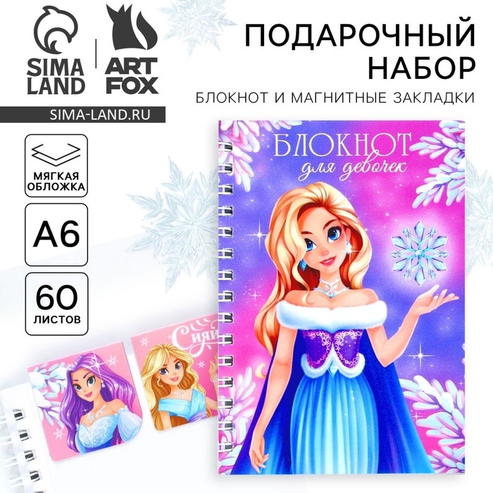 Подарочный набор новогодний, блокнот на спирали А6, 60листов и магнитные закладки 2 шт. «Для девочек»