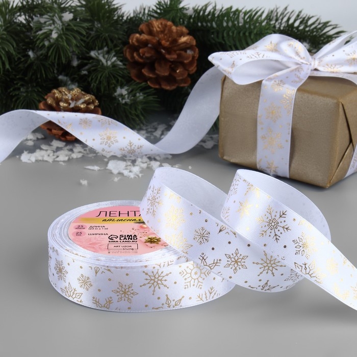 Новый год! Лента атласная с тиснением «Снежинки», 25 мм, 23 ± 1 м, цвет белый/золотой №001