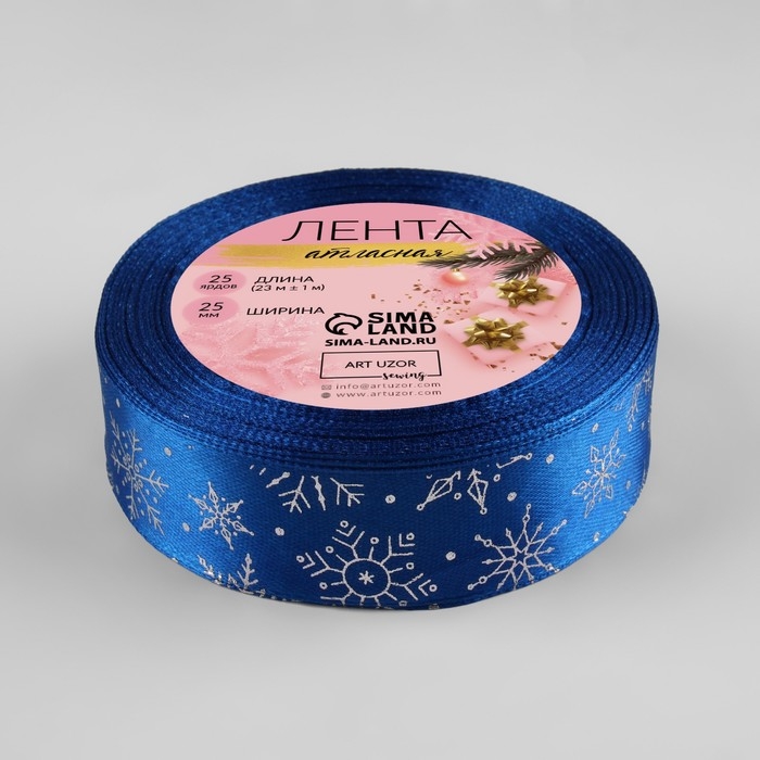 Новый год! Лента атласная с тиснением «Снежинки», 25 мм, 23 ± 1 м, цвет синий/серебряный №122