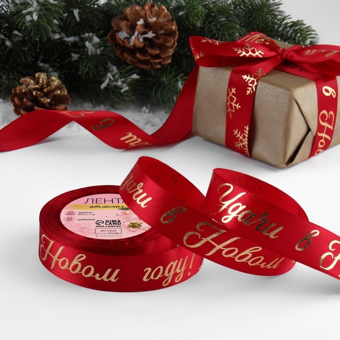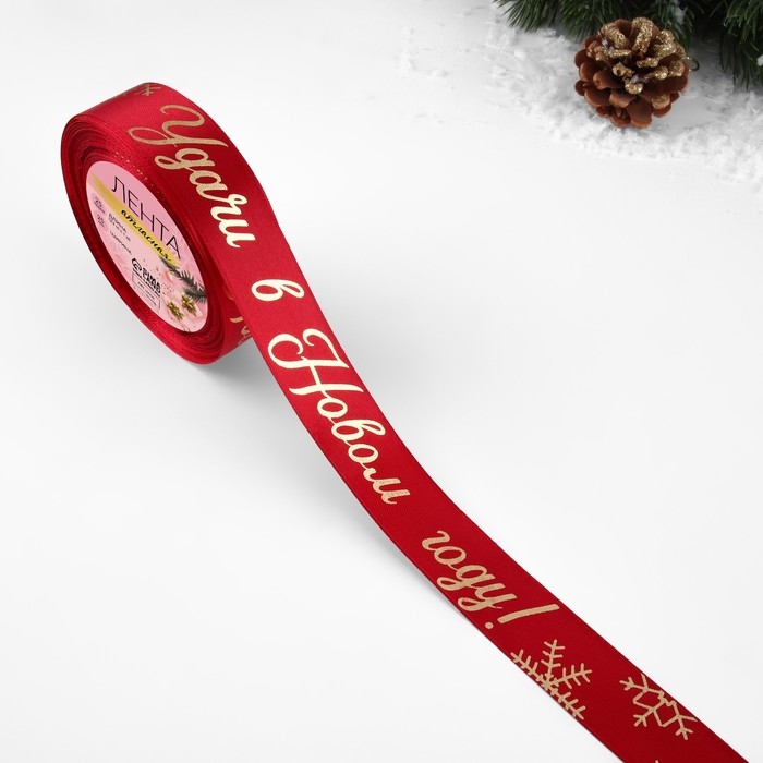 Новый год! Лента атласная с тиснением «Удачи в Новом году!», 25 мм, 23 ± 1 м, цвет красный/золотой №033