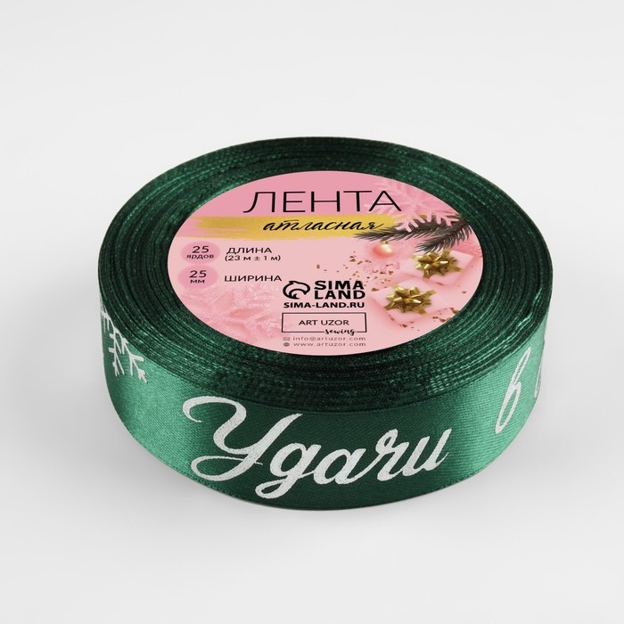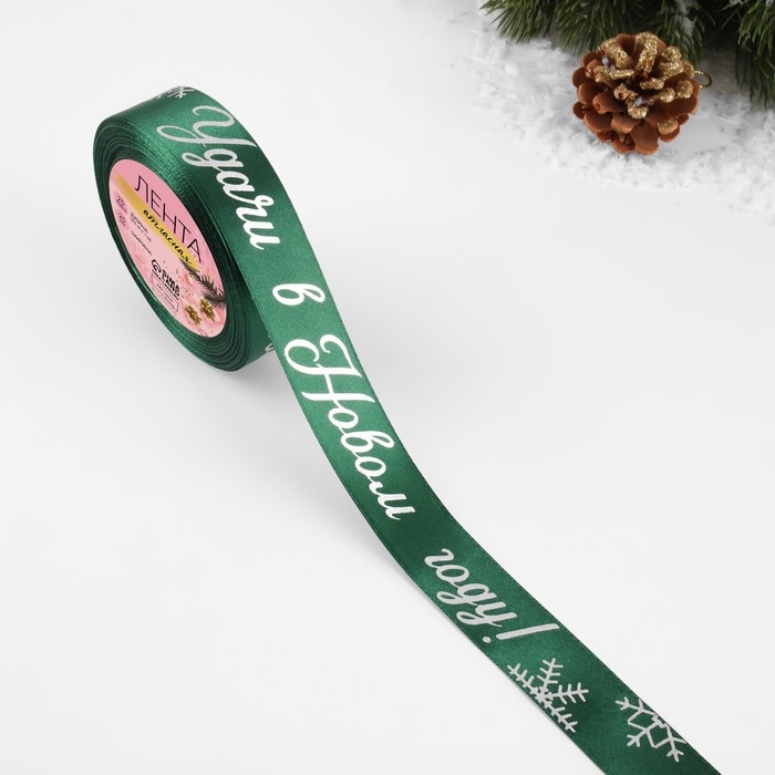 Новый год! Лента атласная с тиснением «Удачи в Новом году!», 25 мм, 23 ± 1 м, цвет зелёный/серебряный №056