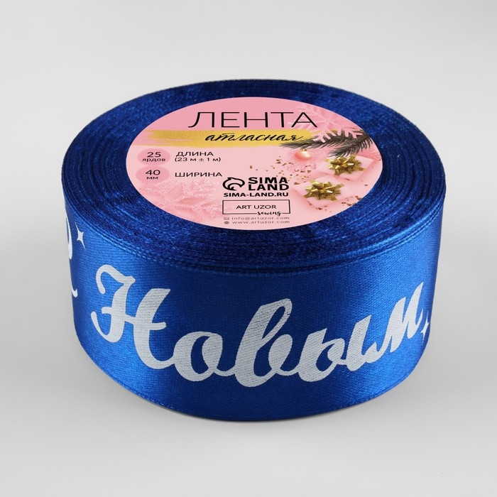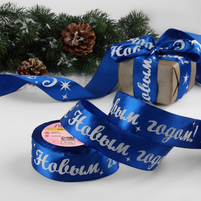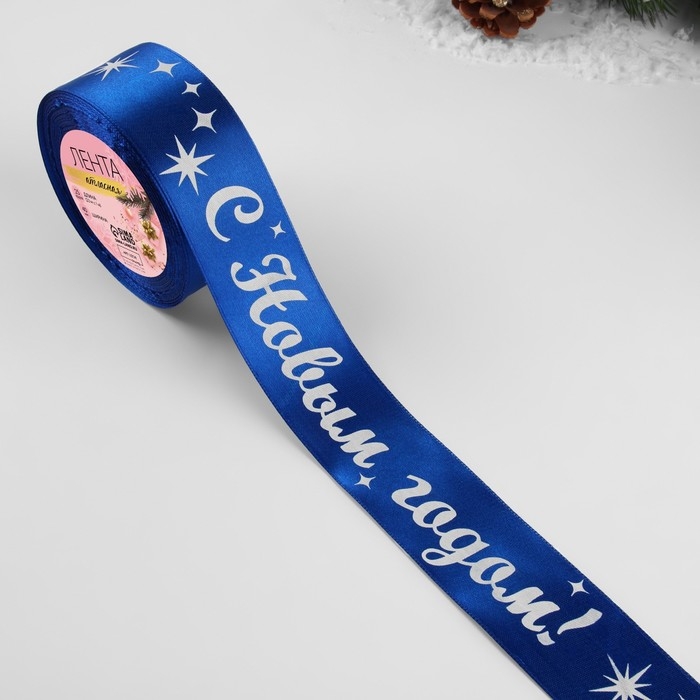 Новый год! Лента атласная «С Новым годом!», 40 мм, 23 ± 1 м, цвет синий/белый №122