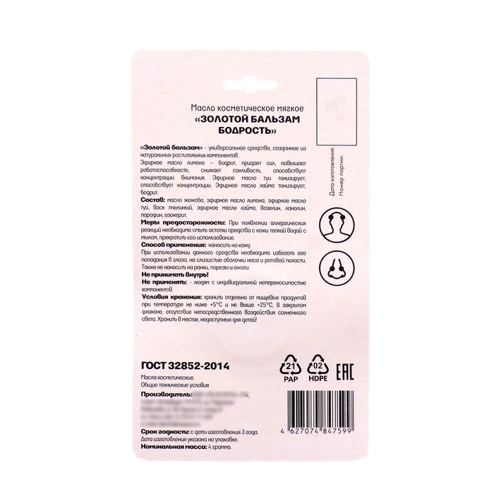 Но это не только аромат! Богатый состав масла косметического Золотой бальзам "Бодрость" бережно ухаживает за вашей кожей. Воск пчелиный, вазелин, ланолин и озокерит питают и увлажняют кожу, делая ее мягкой и шелковистой. Ваши руки будут выглядеть молодыми и ухоженными.