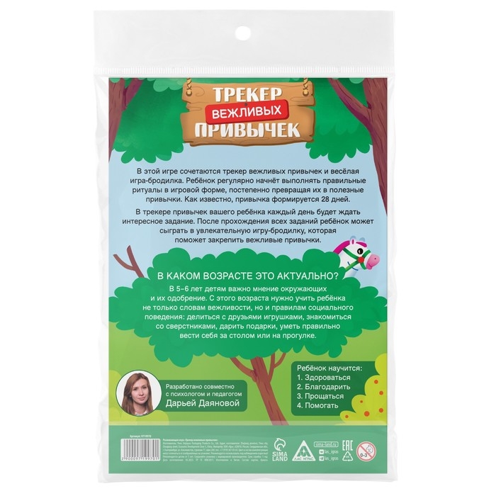Игра, в которой сочетаются трекер вежливых привычек и весёлая игра-бродилка. Ребёнок регулярно начнёт выполнять правильные ритуалы в игровой форме, постепенно превращая их в полезные привычки. Как известно, привычка формируется 28 дней.