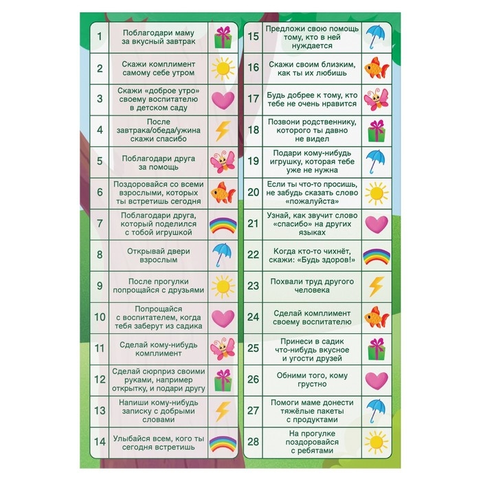 В трекере привычек вашего ребёнка каждый день будет ждать интересное задание. После прохождения всех заданий ребёнок может сыграть в увлекательную игру-бродилку, которая поможет закрепить вежливые привычки.