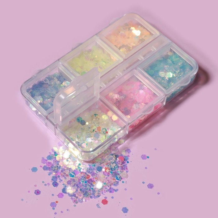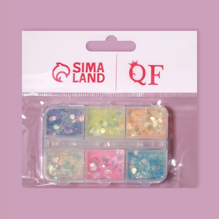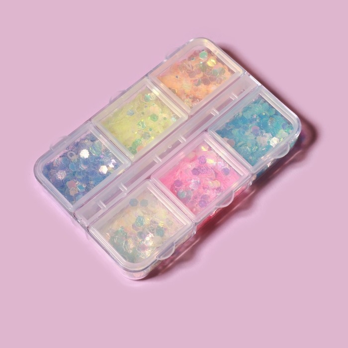 Пайетки для декора ногтей, 6 ячеек, разноразмерные, светятся в темноте, разноцветные