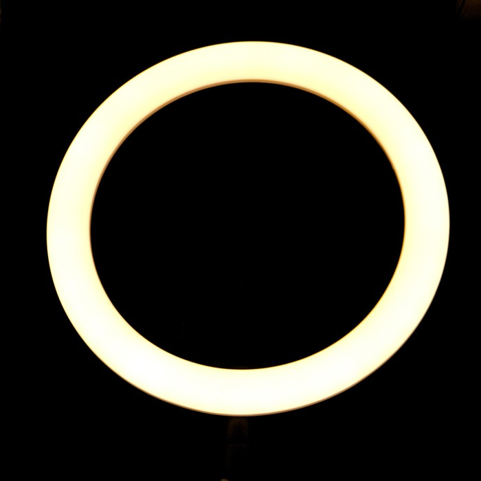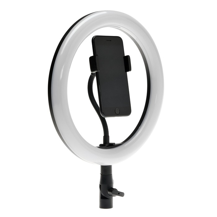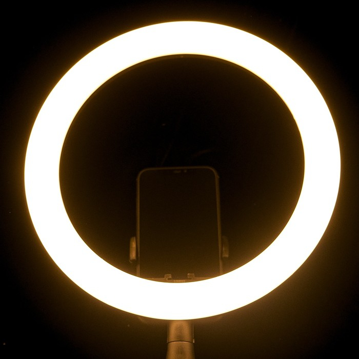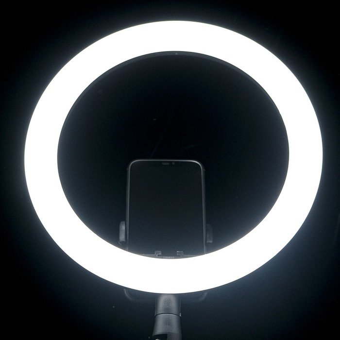 Светодиодная кольцевая лампа на штативе от LuazON поможет создать равномерное освещение для съёмок фото и видео. Штатив позволяет зафиксировать смартфон и регулировать его угол наклона. Для работы подключите устройство к адаптеру питания или к USB-розетке. Выбирайте один из трёх режимов и изменяйте яркость с помощью пульта на проводе.