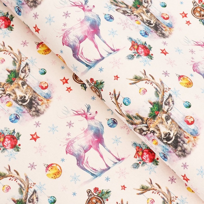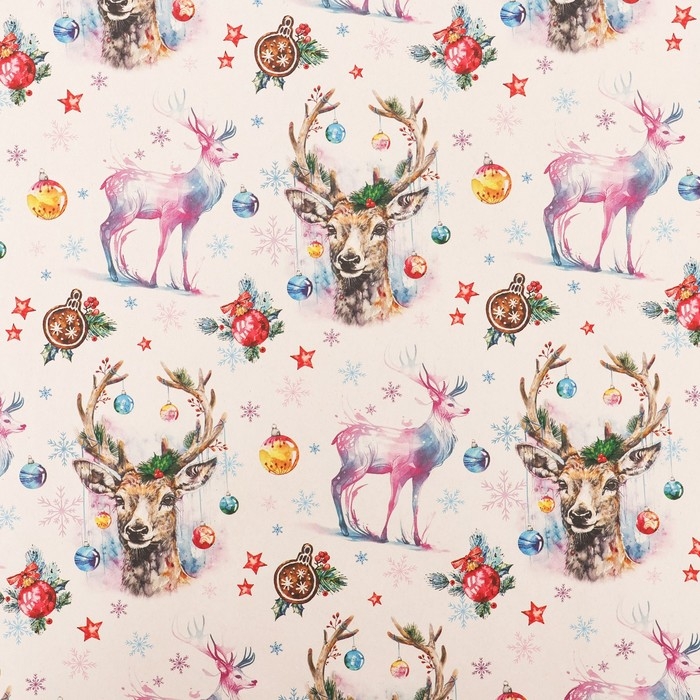 Новый год. Бумага упаковочная крафт белый "Олени", 70 х 100 см,1 лист,