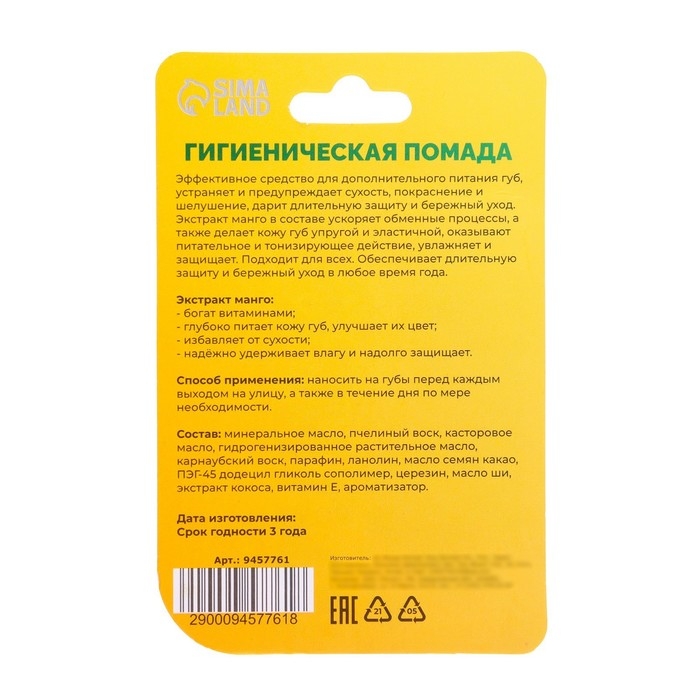 Состав: минеральное масло, пчелиный воск, касторовое масло, гидрогенезированное растительное масло, карнаубский воск, масло семян подсолнечника, масло камелии, парафин, ланолин, масло семян какао, ПЭГ-45 додецил гликоль сополимер, церезин, масло ши, экстракт манго, витамин Е, ароматизатор.