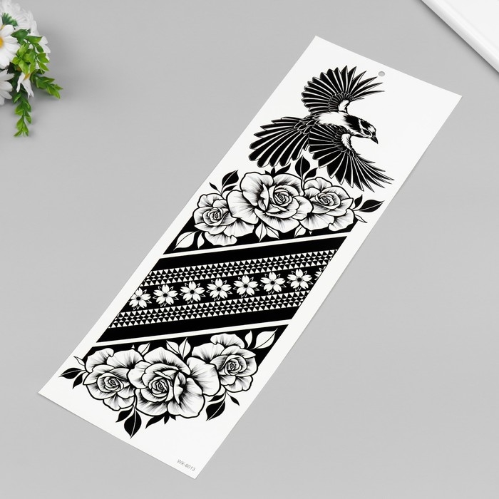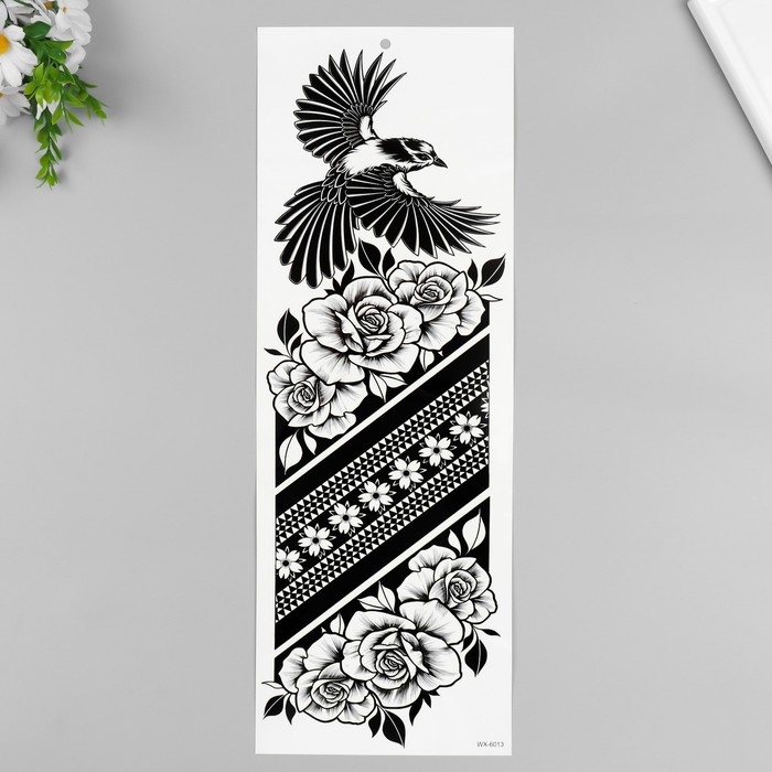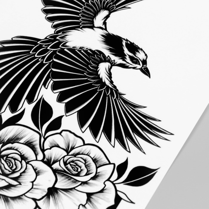 Татуировка на тело черная "Птица и розы" 48х17 см