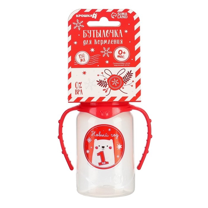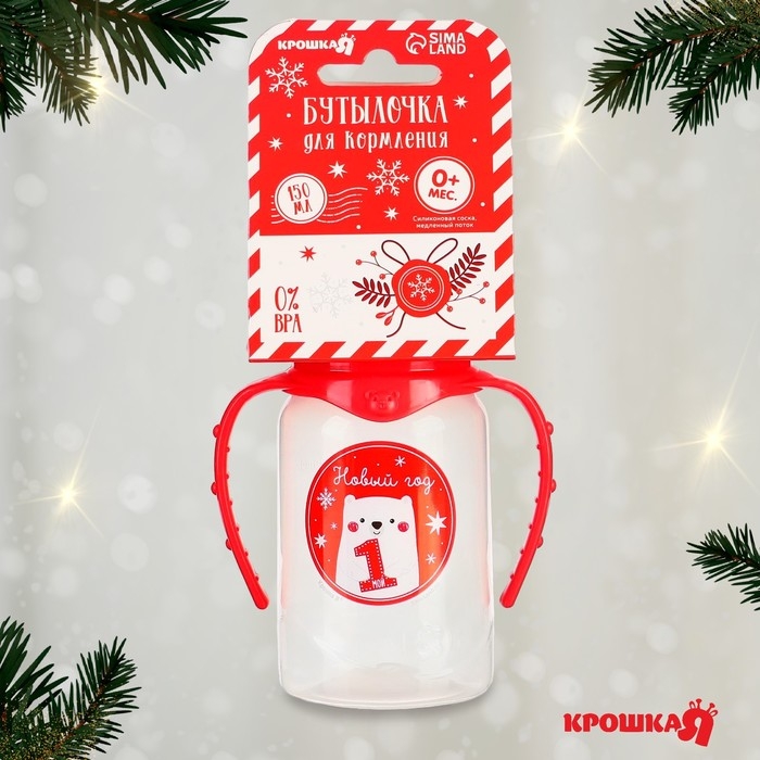 Бутылочка для кормления «Мой 1 Новый год», классическое горло, 150 мл., от 0 мес., цилиндр, с ручками, пожарочная упаковка, Крошка Я