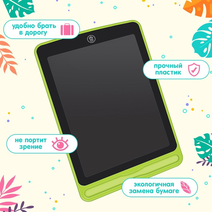 Пластиковый корпус очень лёгкий и тонкий, поэтому игрушку всегда можно взять с собой в дорогу, чтобы ребёнок был занят в пути. Чтобы картинка мгновенно исчезла, достаточно нажать на кнопку с изображением корзины.