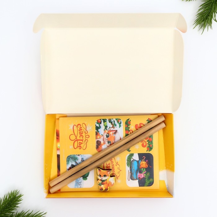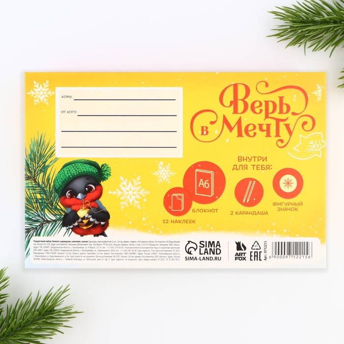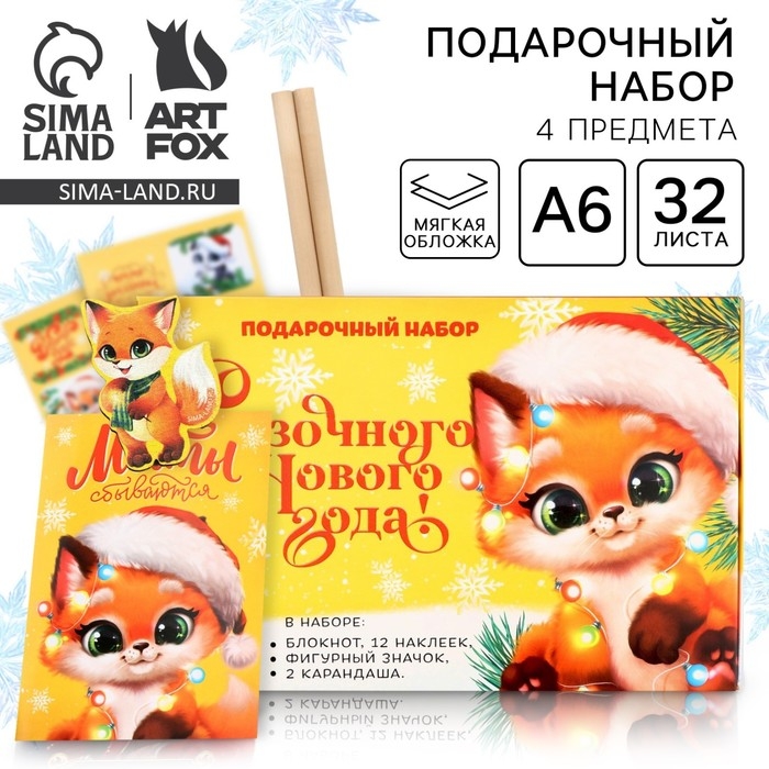 Подарочный набор новогодний блокнот, карандаши, наклейки и значок «Сказочного нового года»