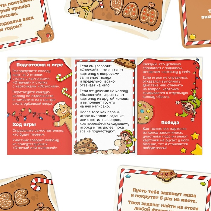 В колоде вас ждёт два вида карточек: одни содержат весёлые новогодние фанты, а вторые – вопросы, на которые нужно честно ответить.