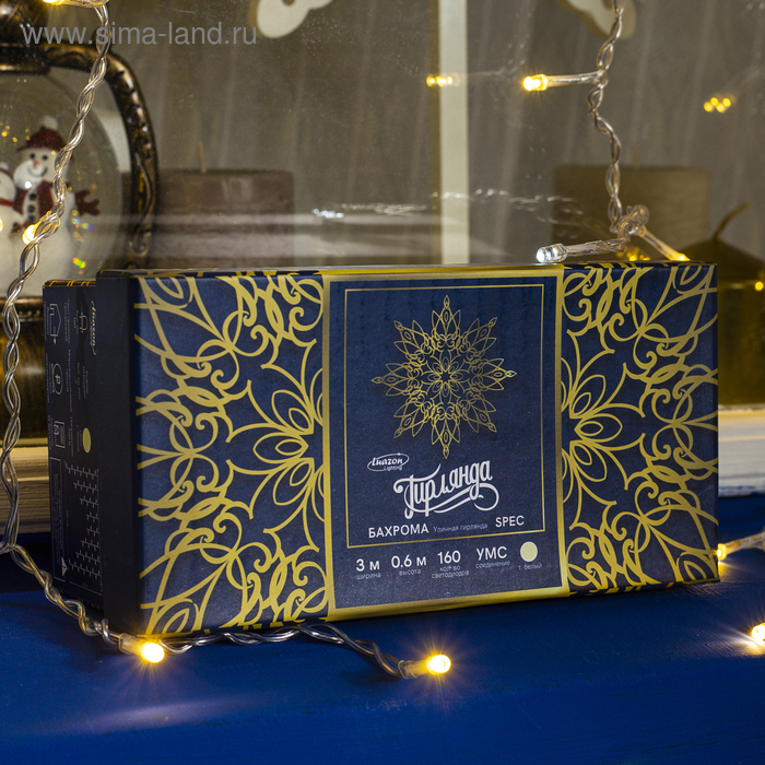 Гирлянда «Бахрома» 3 × 0.6 м, IP44, УМС, прозрачная нить, 160 LED, свечение тёплое белое, мерцание белым, 220 В