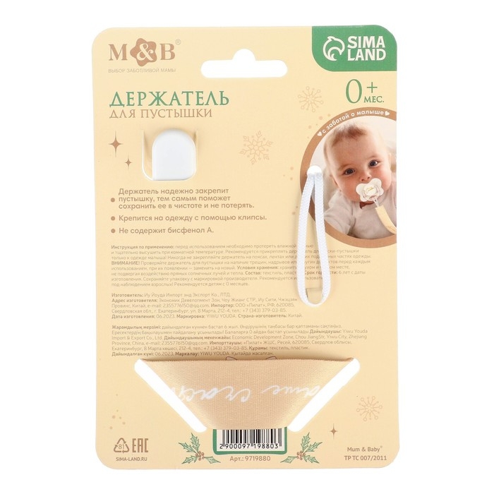 Изделие фиксируется на одежде ребёнка. На конце цепочки есть карабин, который зацепляется за кольцо пустышки. Надёжное крепление убережёт вещь от падения на пол, если малютка случайно выронит её изо рта.