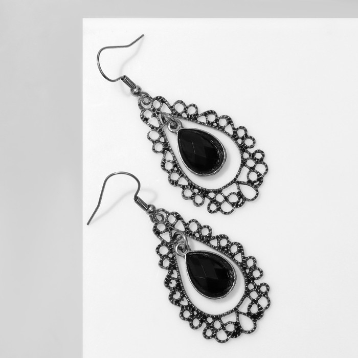 Серьги «Ажур» капля, цвет чёрный в чернёном серебре