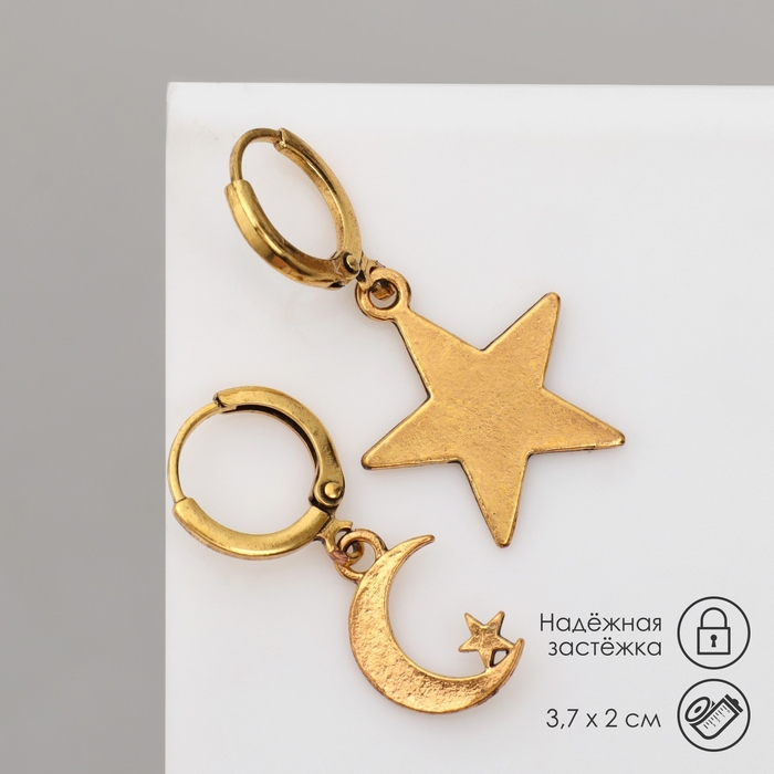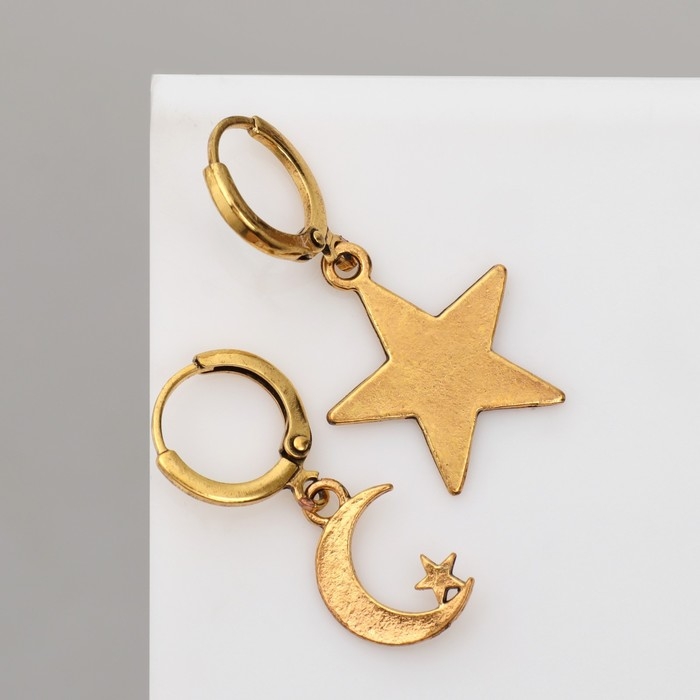Серьги «Ночь» полумесяц и звезды, цвет чернёное золото