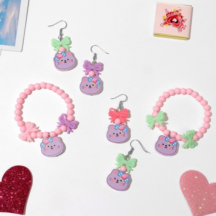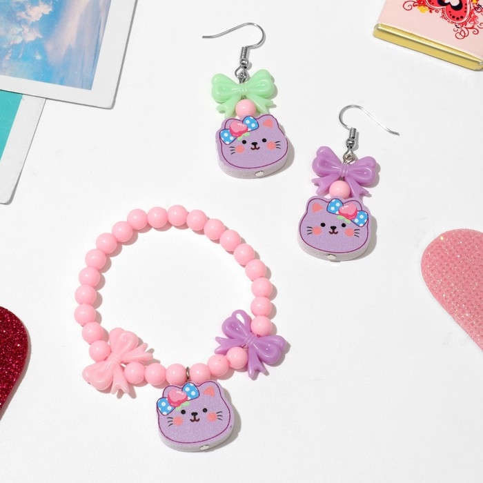 Набор детский «Выбражулька» 2 предмета: серьги, браслет, кошечка, цвет МИКС
