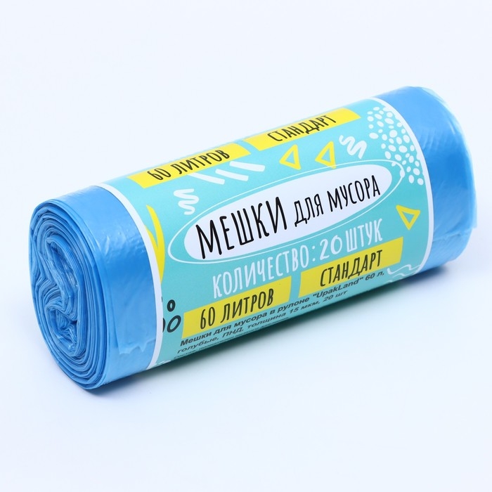 Мешки для мусора в рулоне "UpakLand" 60 л, голубые, 60 x 80 см, ПНД, толщина 15 мкм, 20 шт