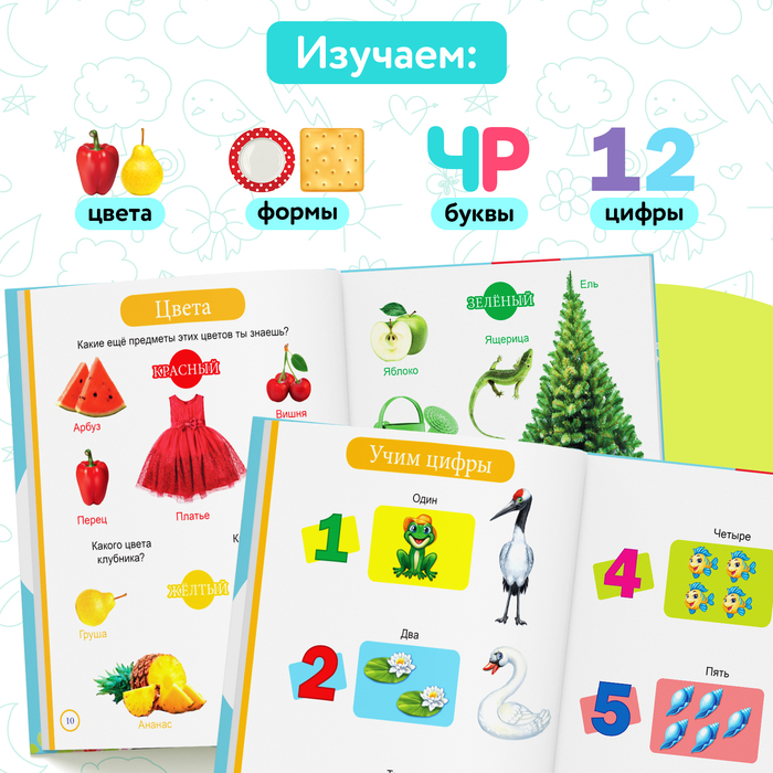 Книга познакомит с названиями любимых игрушек и одежды, животных и растений, овощей и фруктов. Малыш научится верно определять цвета и формы, ориентироваться во временах года, обучится счёту и буквам, узнает, какие бывают профессии.