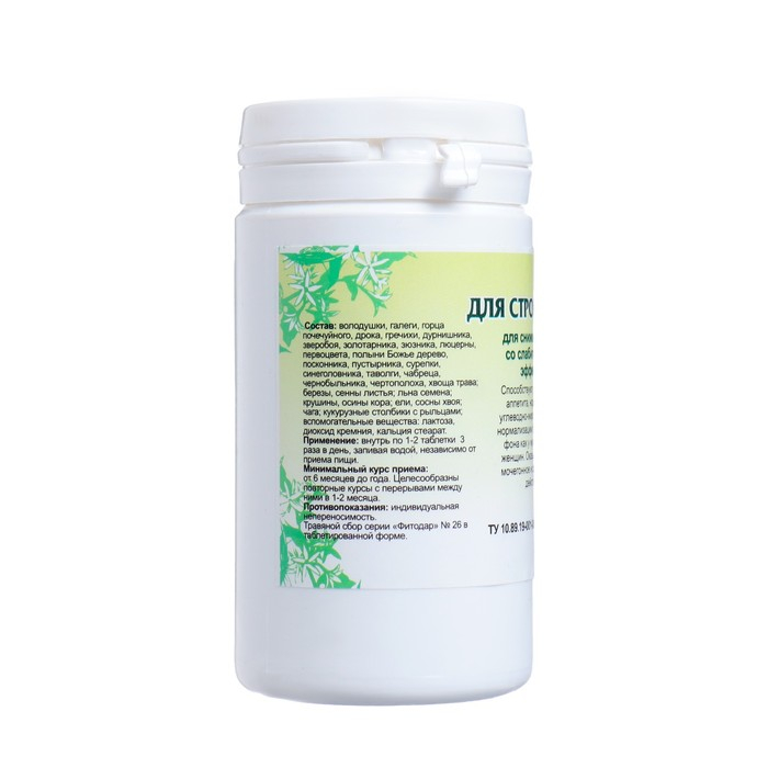 Состав: володушки, галеги, горца, гречихи, дербенника, дурнишника, зверобоя, золотарника, зюзника, люцерны, манжетки, медуницы, пастушьей сумки, первоцвета, подмаренника, полыни Божье дерево, синеголовника, сурепки, таволги, чабреца, хвоща трава; березы, сенны, смородины листья; льна семена; осины кора; чага; кукурузные столбики с рыльцами; вспомогательные вещества лактоза, аэросил, кальция стеарат.