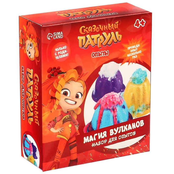 С набором для опытов «Сказочный патруль: Магия вулканов» ребёнок проведёт химические эксперименты, узнает, как извергаются вулканы, что нужно, чтобы сделать снег и изготовить правдоподобную лаву.
