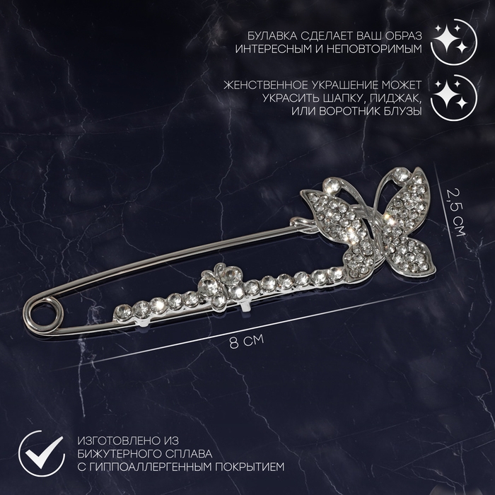 Данная булавка – настоящая находка для модниц, предпочитающих нетривиальные аксессуары. Брошь-булавка станет не только оригинальным дополнением вашего наряда, но и позволит без труда приколоть при необходимости палантин или шейный платок. Используйте её в качестве украшения шляпки, рубашки или галстука. Булавка «Бабочки» дуэт, 8 см, цвет белый в серебре внесёт особую нотку изящности в ваш образ.