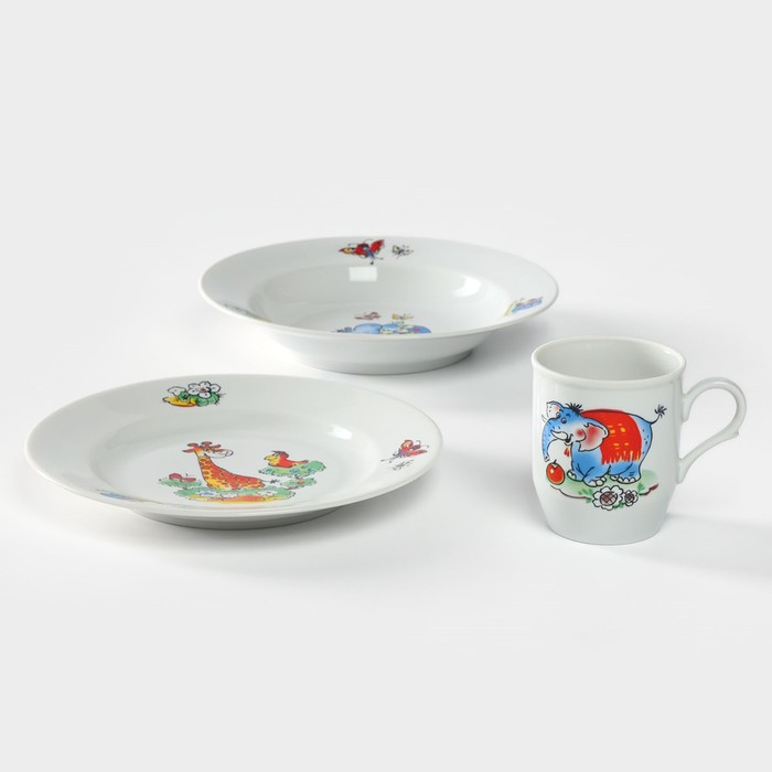 Набор посуды фарфоровой «Зоопарк», 3 предмета: тарелка d=20 см, салатник d=19,8 см, кружка 200 мл