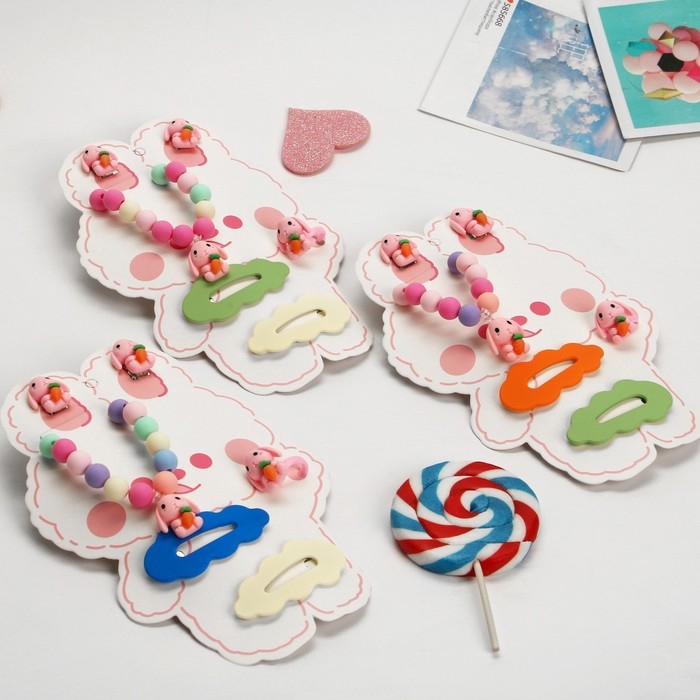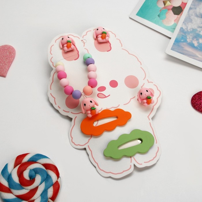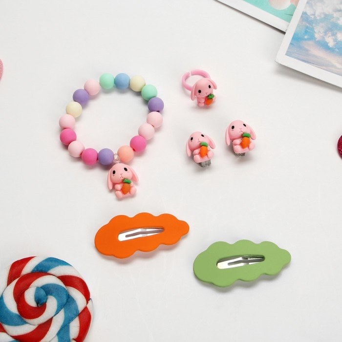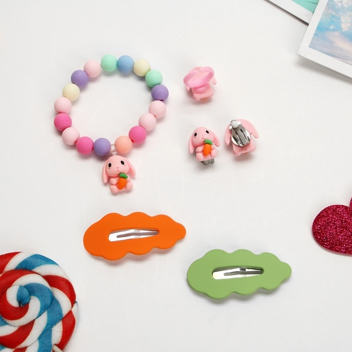 Комплект детский «Выбражулька» 5 предметов: 2 заколки, клипсы, браслет, кольцо, зайчик, цветной