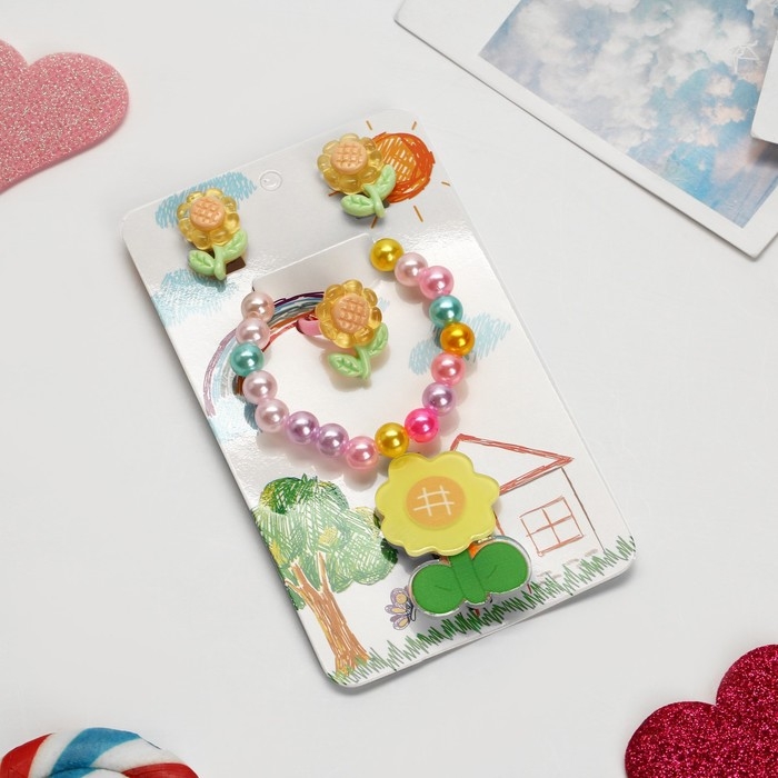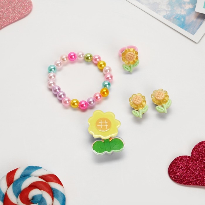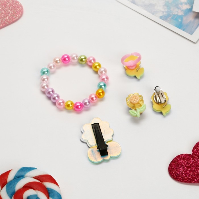 Комплект детский «Выбражулька» 4 предмета: заколка, клипсы, браслет, кольцо, цветочки, цветной