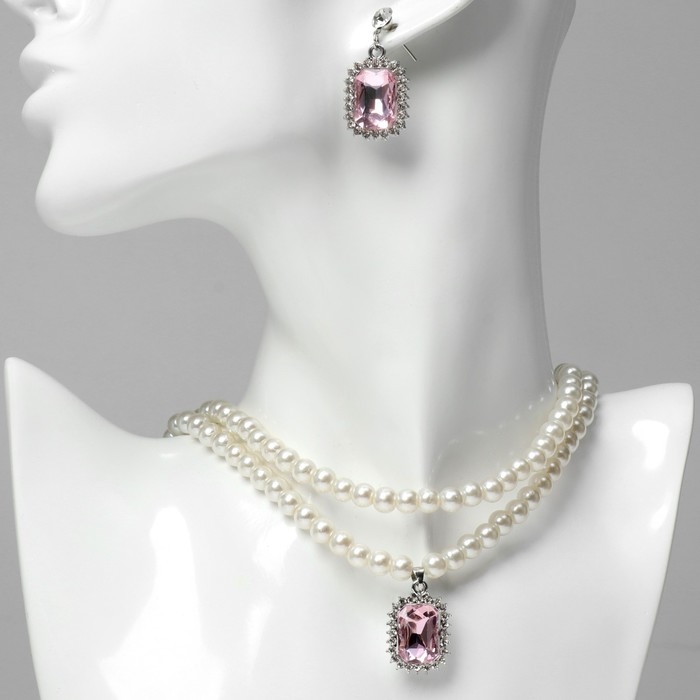 Набор 2 предмета: серьги, колье «Катрин» розовая вставка, цвет белый в серебре, 45 см