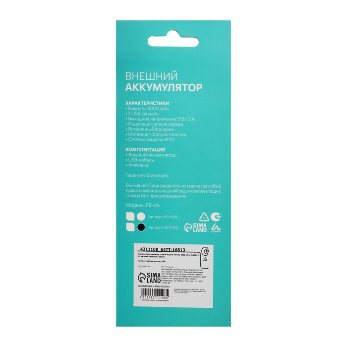 Внешний аккумулятор Luazon модель PB-05, 6000 мАч, 3хUSB, 2 А, дисплей, фонарик, белый