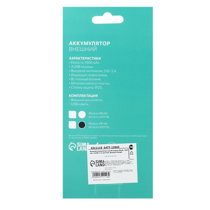 Внешний аккумулятор Luazon PB-04, 7500 мАч, 3 USB, 2 А, дисплей, фонарик, белый