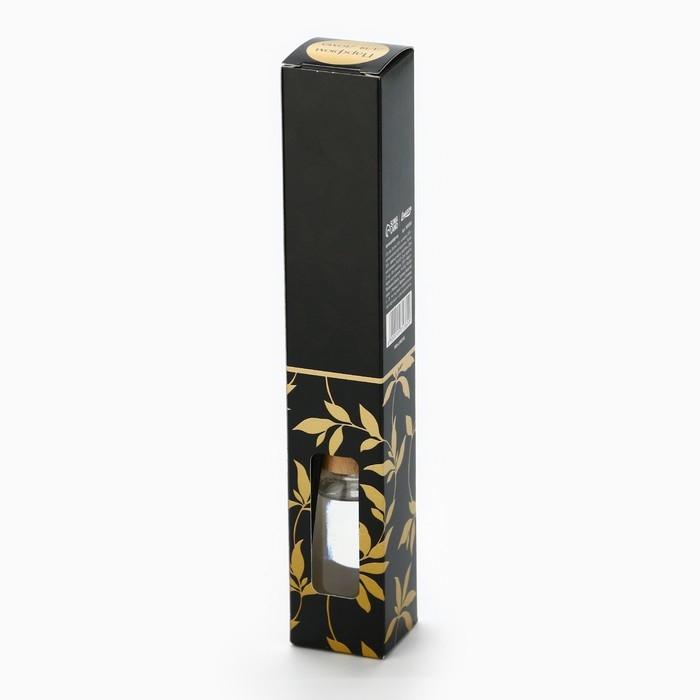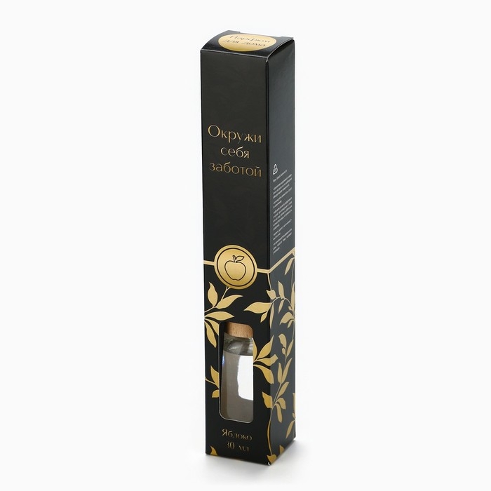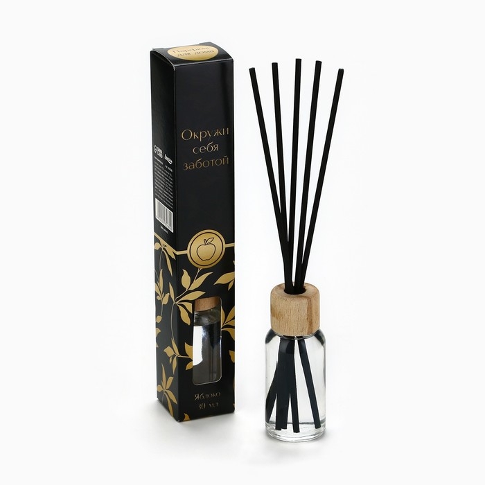 Этот стильный диффузор с ароматом яблока - идеальный подарок для себя или близких! Он упакован в красивую картонную коробку черного цвета с золотистым декором. Внутри вы найдете стеклянную бутылочку с ароматической жидкостью и набор деревянных палочек.