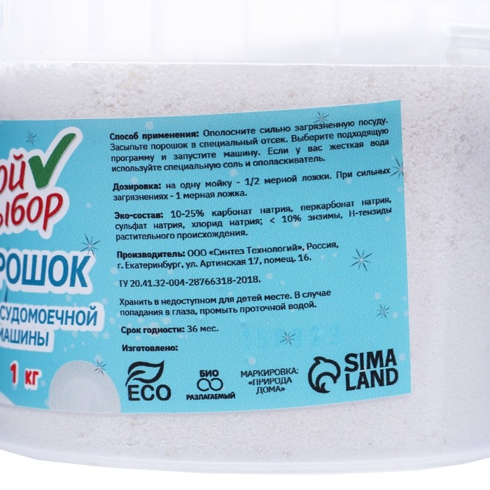 - Объем: Упаковка содержит 1 кг порошка, что обеспечивает достаточное количество продукта для нескольких циклов посудомоечной машины.