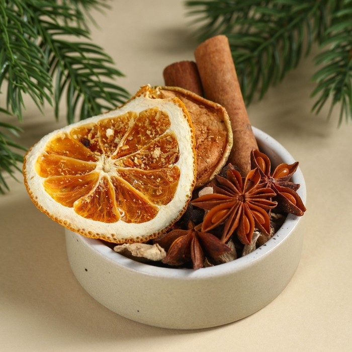 Состав: апельсин сушёный, яблоко сушёное, цедра апельсина, цедра мандарина, корица (палочки), гвоздика, бадьян, кардамон.