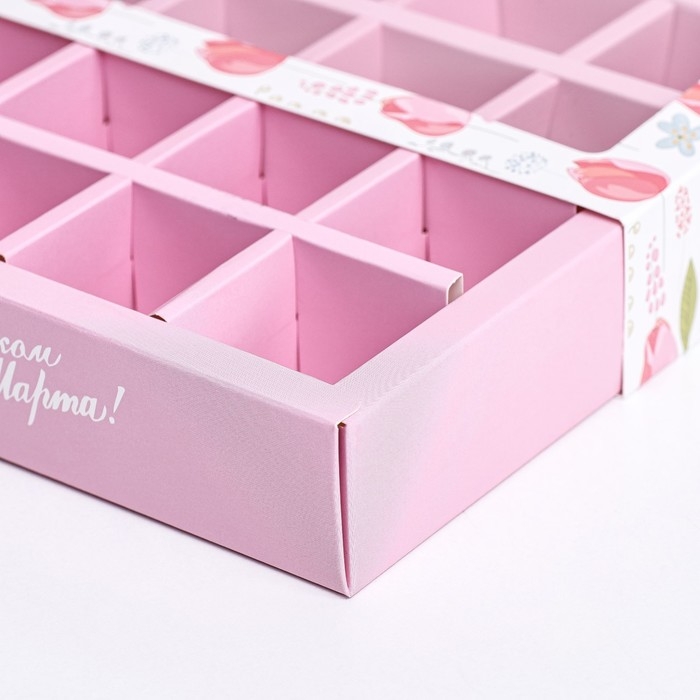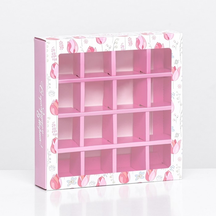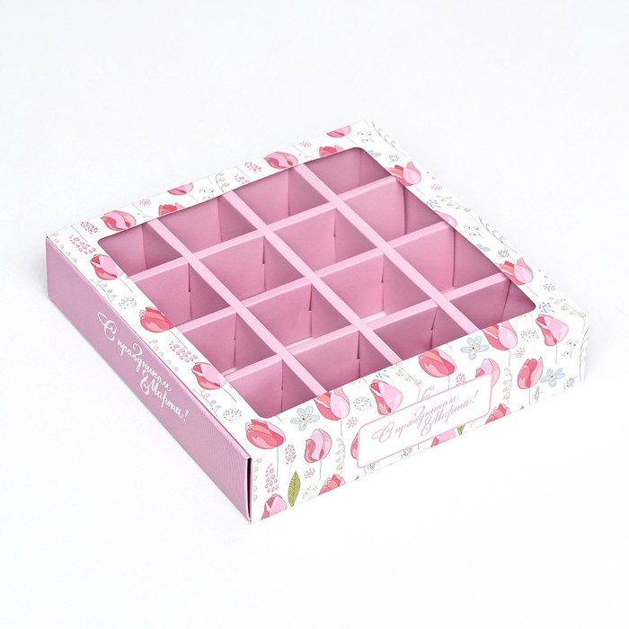 Коробка для 16 конфет, " 8 марта" 17,7 х 17,7 х 3,8 см. Кондитерская упаковка