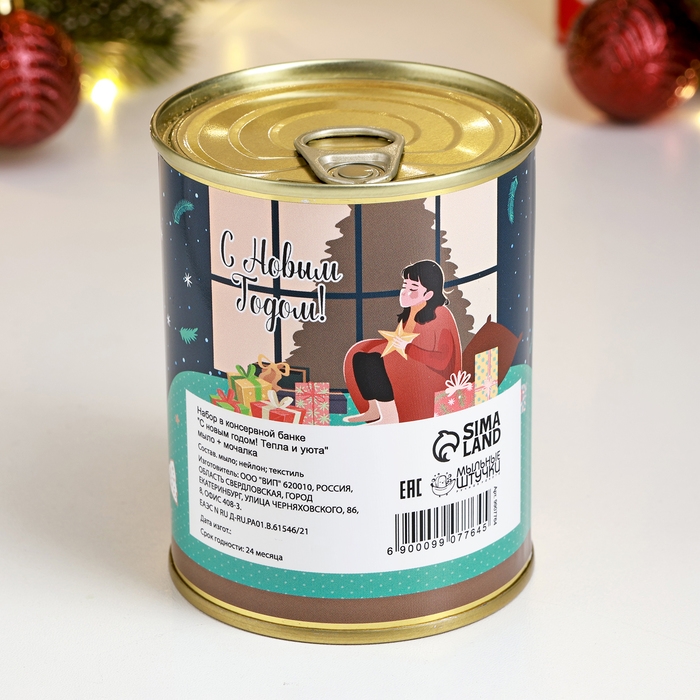 Набор в консервной банке "С новым годом! Тепла и уюта" мыло + мочалка