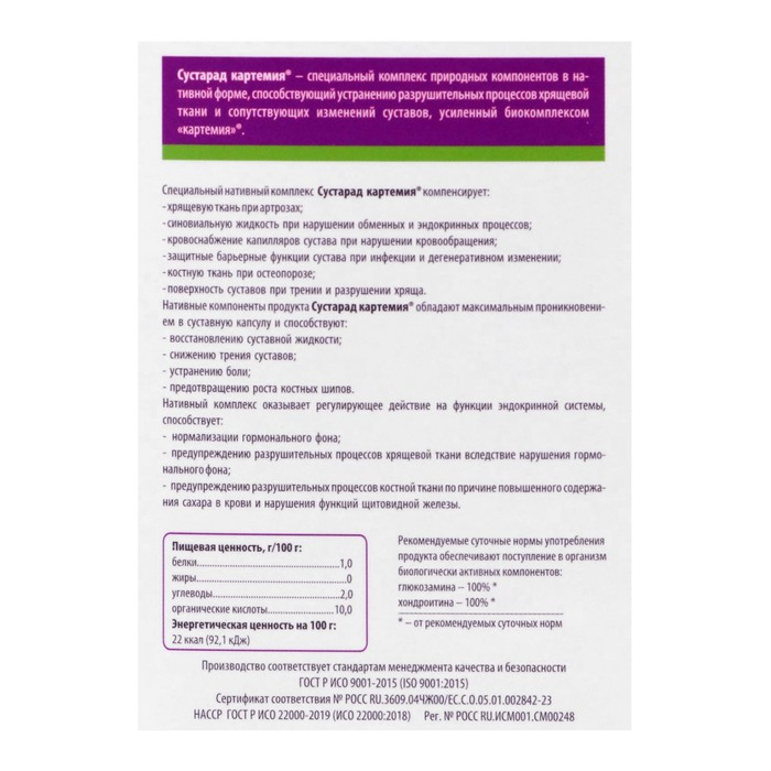 «Сустарад» картемия® – специальный сбалансированный комплекс природных компонентов в нативной форме, оказывающий выраженное восстановительное действие на хрящевую ткань, суставные поверхности эпифизов костей сустава, синовиальную жидкость и околосуставные ткани. Механизм действия природных компонентов «Сустарад» картемия® основан на действии непосредственно на причину разрушения сустава и суставных элементов, устранение симптомов и сопутствующих изменений.