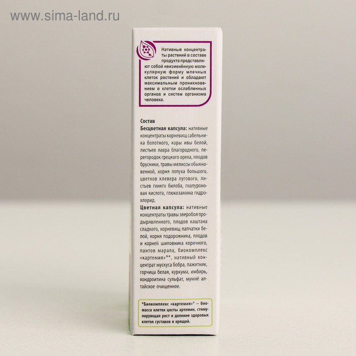 Цветная капсула: нативный концентрат травы зверобоя продырявленного, нативный концентрат плодов каштана сладкого, нативный концентрат корневищ лапчатки белой, нативный концентрат корня подорожника, нативный концентрат плодов и корней шиповника коричного, нативный концентрат пантов марала, биокомплекс «картемия»®, нативный концентрат мускуса бобра, пажитник, горчица белая, куркума, имбирь, хондроитина сульфат, мумиё алтайское очищенное.