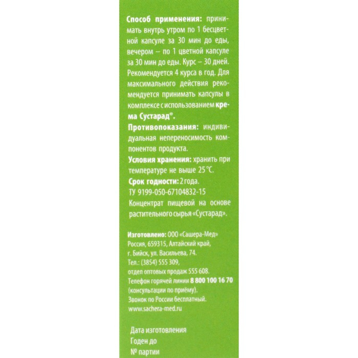 Для максимального действия рекомендуется принимать капсулы в комплексе с использованием крема «Сустарад».
