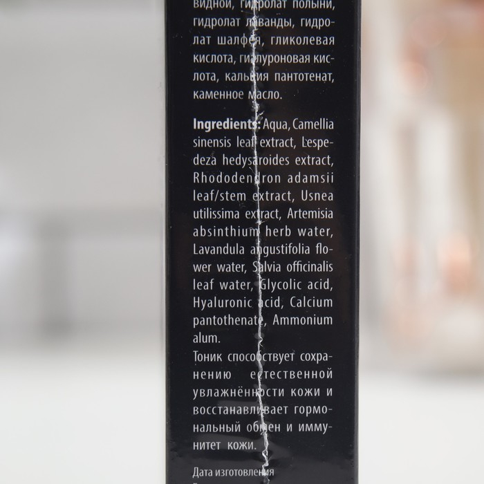 Состав: вода, экстракт зелёного чая, экстракт леспедецы, экстракт сагаандали, экстракт уснеи нитевидной, гидролат полыни, гидролат лаванды, гидролат шалфея, гликолевая кислота, гиалуроновая кислота, кальция пантотенат, каменное масло.