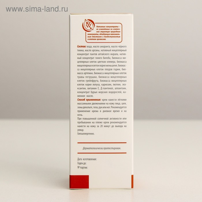 Органическая мицеллярная форма крема позволяет бережно корректировать дефекты кожи, способствует глубокому проникновению во внутренние слои кожи, наполняя клетки кожи влагой, предотвращает сухость и образование морщин. Мощный антиоксидантный комплекс на основе пантов марала, карнозина и лютеина надёжно защищает кожу от фотостарения, возрастных изменений, дряблости, возвращает тонус и упругость и позволяет устранить симптомы целлюлита, т.к. обладает повышенной проникающей активностью.