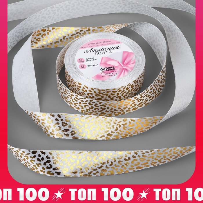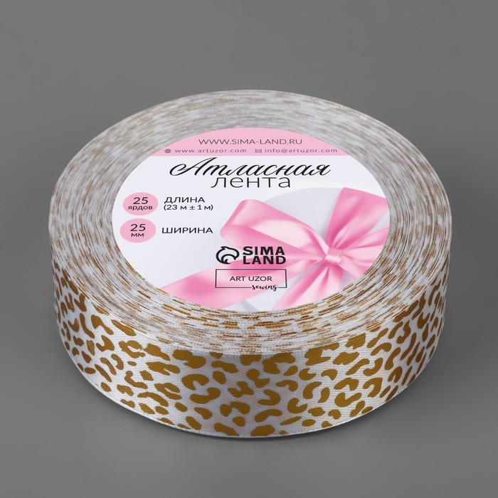 Лента атласная с тиснением «Леопард», 25 мм, 23 ± 1 м, цвет белый/золотой