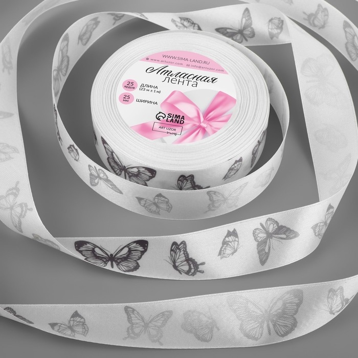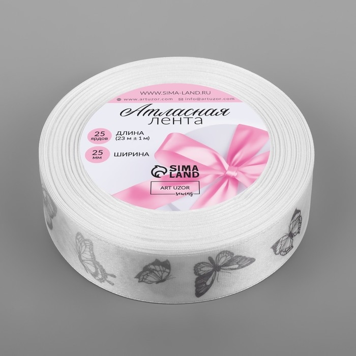 Лента атласная «Серебряные бабочки», 25 мм, 23 ± 1 м, цвет белый