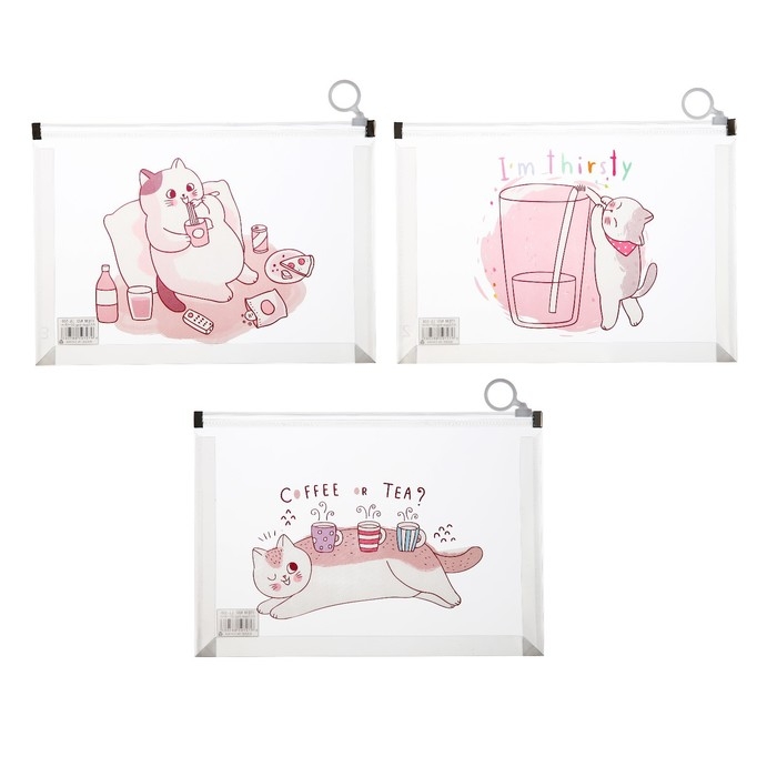 Папка-конверт на молнии формат А5, 180мкр, с рисунком "Кот", МИКС