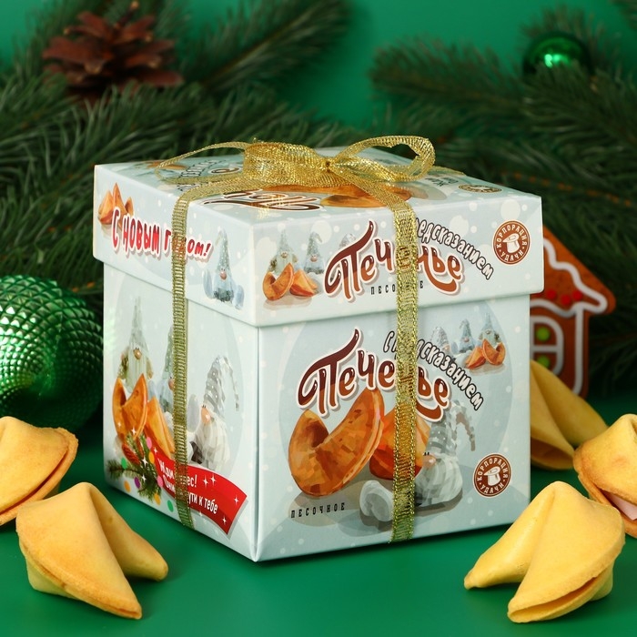 Несмотря на то, что печенье - вкусный десерт, это контейнер предсказания. За это его и любят. 5 штук печенья упакованы в оригинальную коробочку. Внутри каждого печенья - текст, который заставит вас улыбнуться, подумать, помыслить, счесть случайность закономерностью, и даже поверить в чудо!