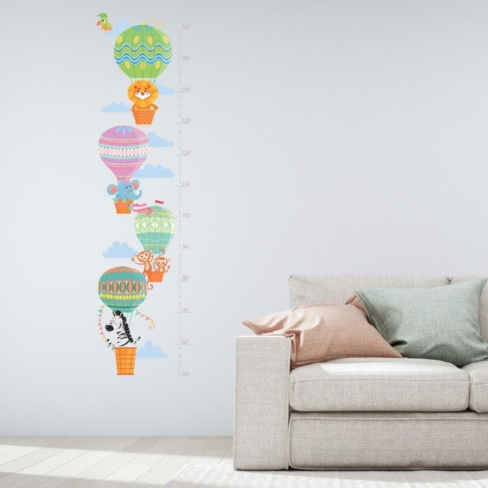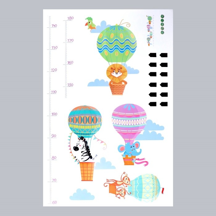 Наклейка пластик интерьерная цветная ростомер "Животные на воздушных шарах" 60x90 см