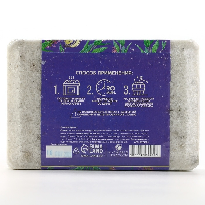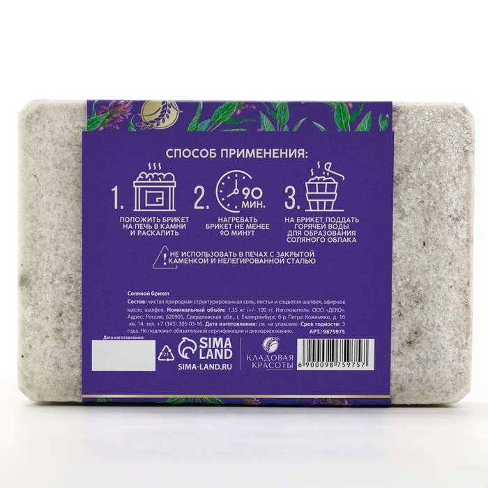 Соляной брикет с эфирным маслом шалфея, 1.35 кг, аромат шалфея, КЛАДОВАЯ КРАСОТЫ